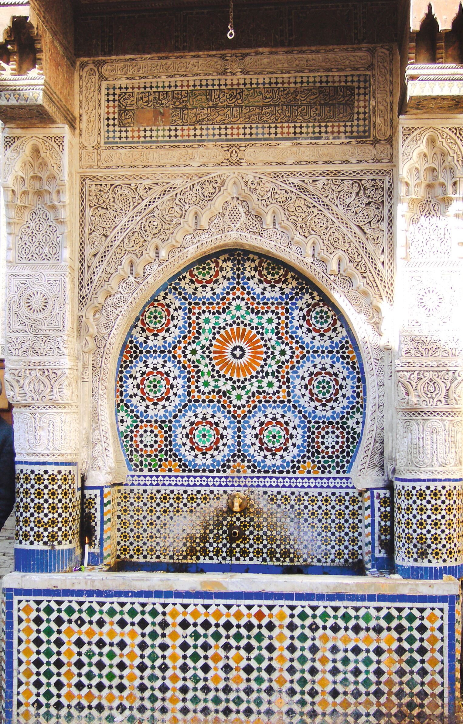 Journée de visites de Fès : Fès el-Jdid et son mellah (ancien quartier juif), portes du Palais royal. Découverte de l’atmosphère unique de la médina de Fès el-Bali : médersa Bou-Inania ou Attarine (sous réserve, une médersa pouvant toujours être fermée), université islamique Karaouiyine (ext.), fontaine Nejjarine, souks, musée Nejjarine des arts et métiers du bois (dans un ancien caravansérail). Déjeuner typique dans un ancien palais de la médina.
